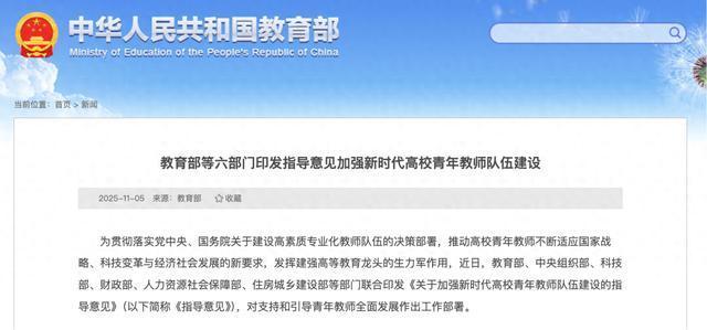 近日,教育部、中央组织部、科技部、财政部、人力资源社会保障部、住房城乡建设部等部门联合印发《关于加强新时代高校青年教师队伍建设的指导意见》,对支持和引导青年教师全面发展作出工作部署。