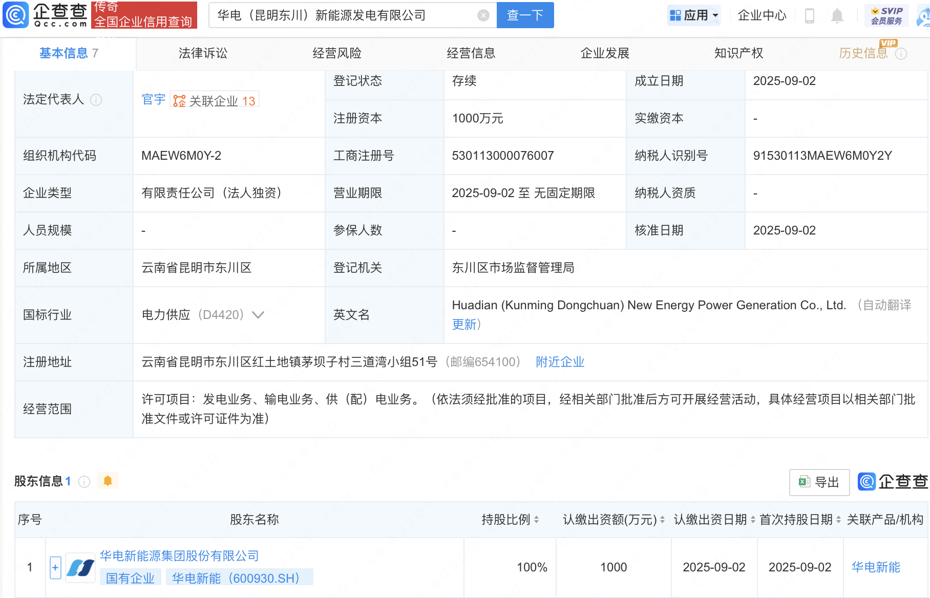 近日,华电(昆明东川)新能源发电有限公司成立,注册资本1000万元,经营范围包含:发电业务、输电业务、供(配)电业务。企查查股权穿透显示,该公司由华电新能(600930)全资持股。
