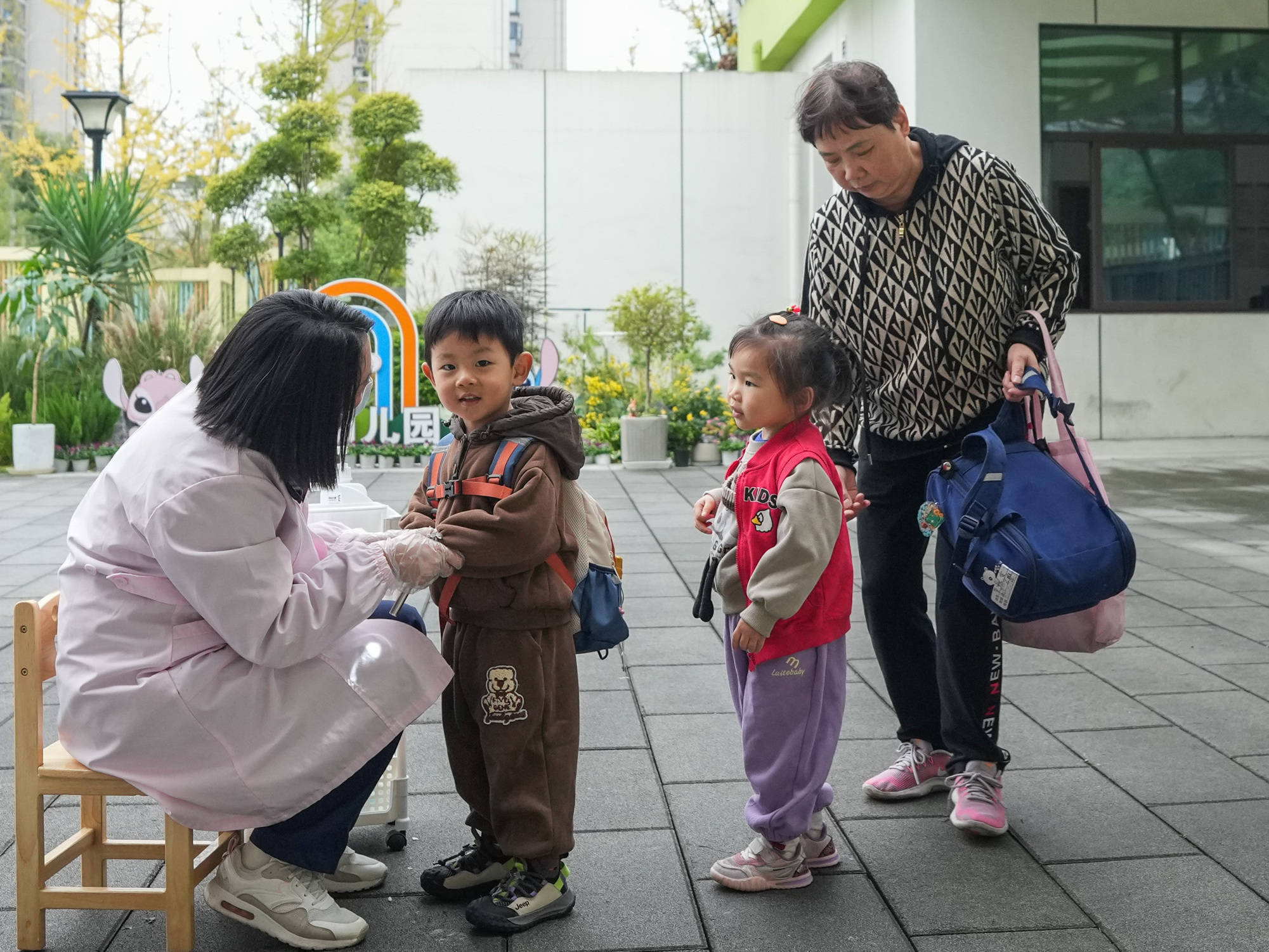 11月4日,家长带着小朋友在四川省成都市龙泉驿区灵瑞幼儿园进行入园检查。(听听家长们对于“满三入园”政策的感受)