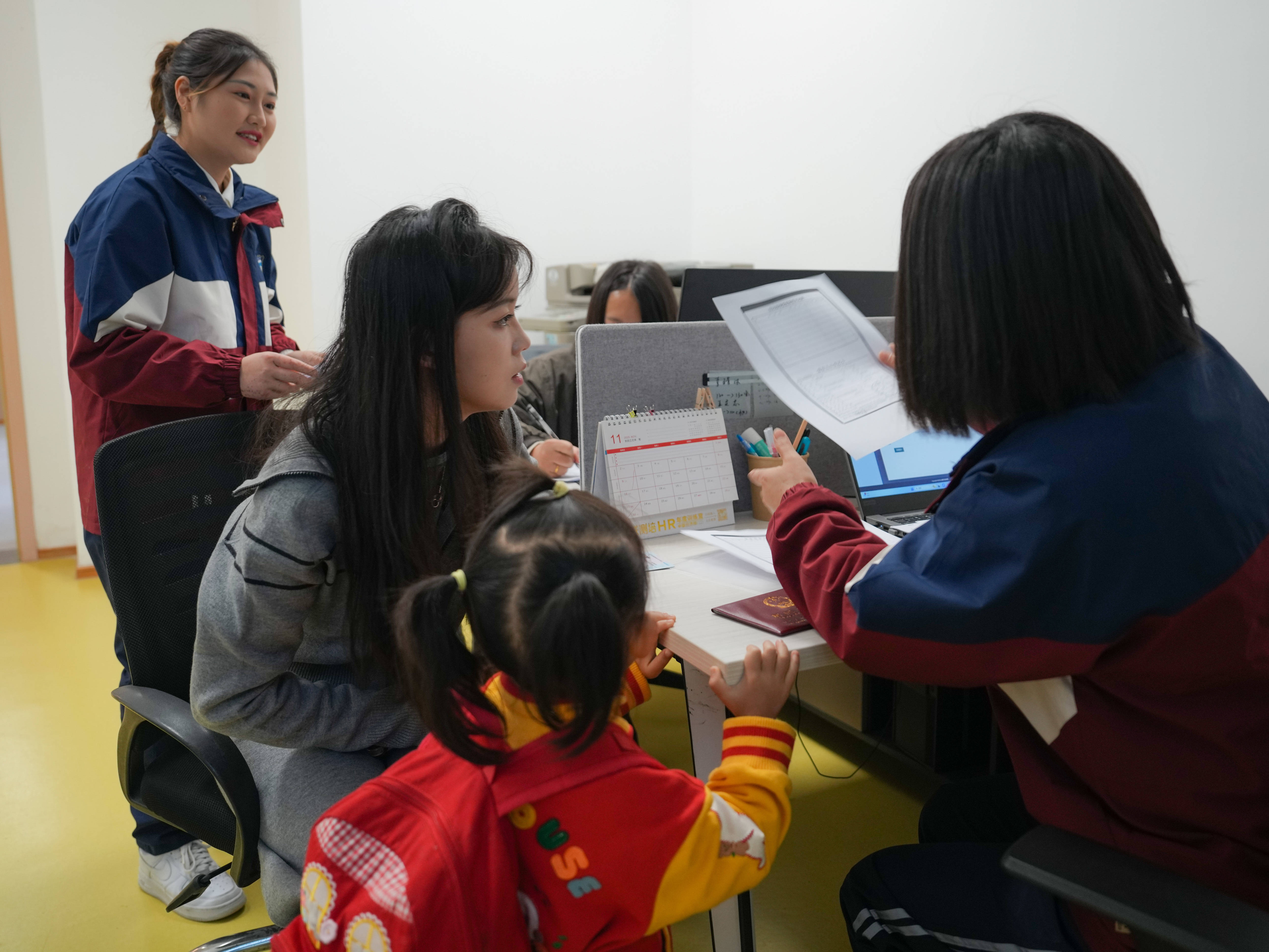 11月4日,家长带着小朋友在四川省成都市龙泉驿区灵瑞幼儿园填写新生入园调查表。