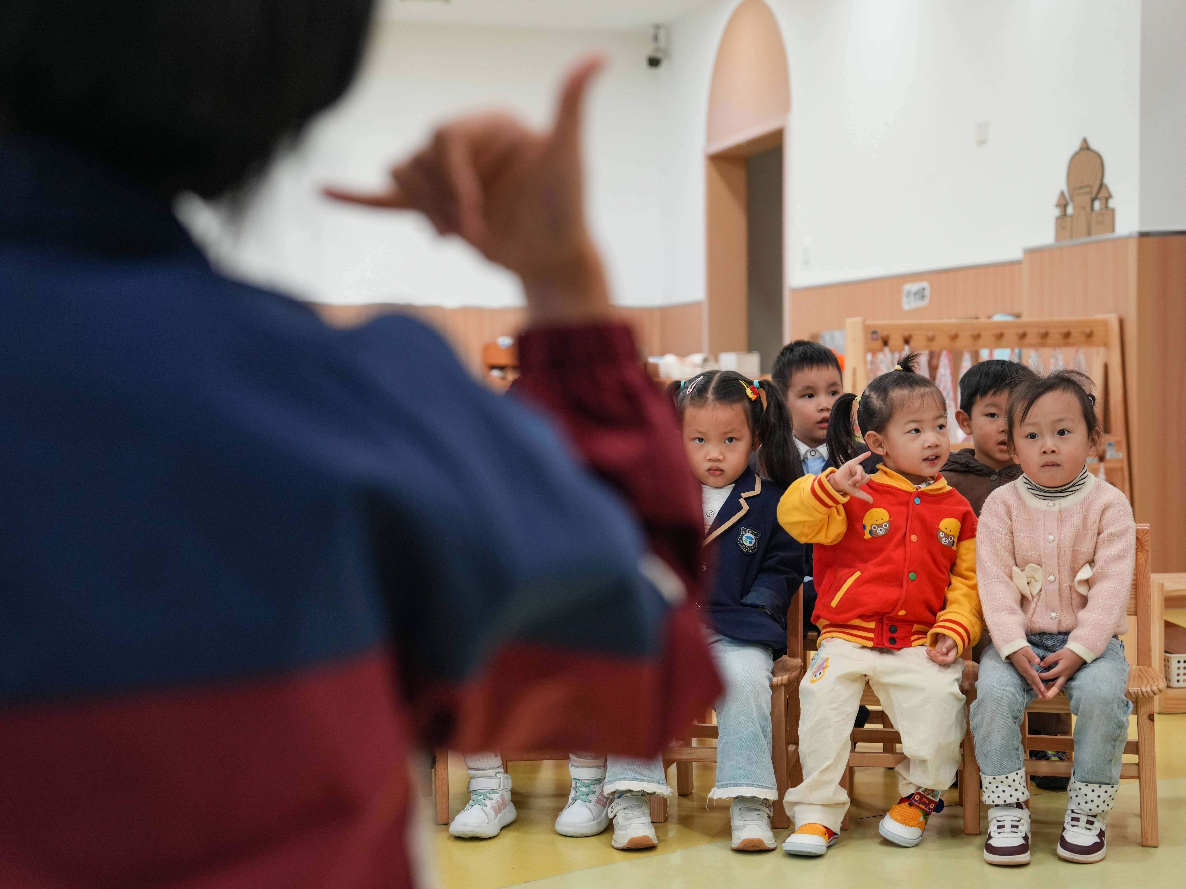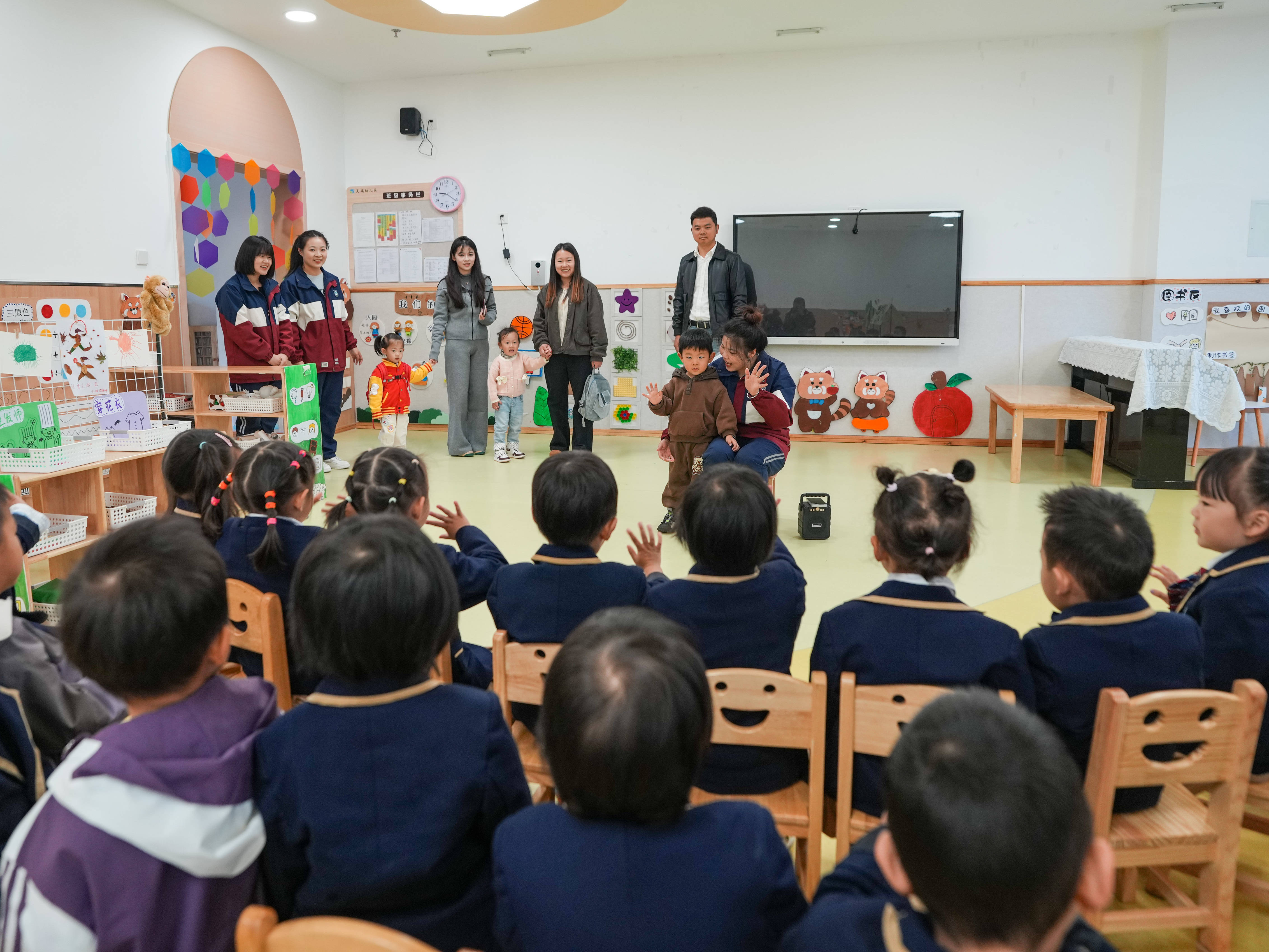 11月4日,老师带着新入学小朋友在四川省成都市龙泉驿区灵瑞幼儿园做课堂互动游戏。